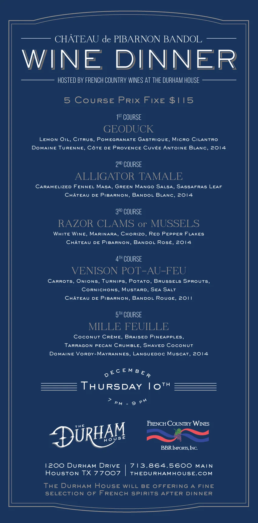 Bandol is one of the most prestigious appellations in the world, where the grape Mourvèdre is king. The wines being paired with this dinner show it at its best. Here is the opportunity to experience the finesse and liveliness of Clairette and Bourboulenc in the Pibarnon Blanc; the fattiness and boldness of the Mouvèdre/Cinsault blend in the Pibarnon Rosé ; and how the Pibarnon Rouge, made of 90% Mourvèdre, with its mature fruits and spice, brings the character of the fine wines of Bandol into perspective.