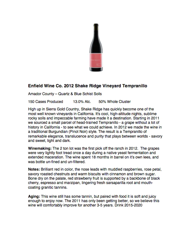 w/ 2012 Shake Ridge Vineyard Tempranillo